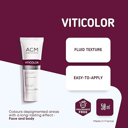 The ACM Viticolor Durable Skin Camouflage Gel is a long-wearing cosmetic product formulated to cover visible skin discolorations and textural variations, such as vitiligo, scars, blemishes, and hyperpigmentation. Its durable composition maintains consistent coverage through typical daily conditions and delivers a uniform, natural-appearing skin tone.