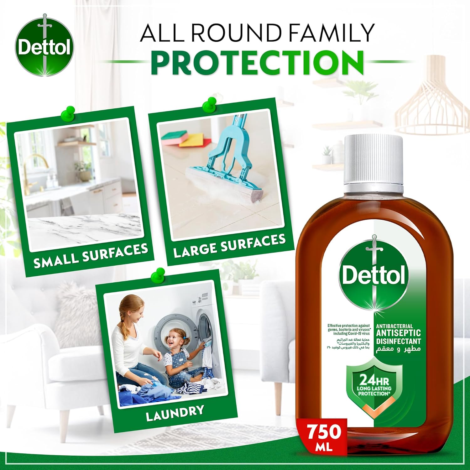 Dettol Antiseptic Disinfectant Liquid is designed for use in household cleaning and hygiene applications. This multi-pack includes two 750ml bottles and one 500ml bottle, providing a combined volume for extended use. The product is formulated to kill 99.9% of bacteria and viruses and may be used for surface disinfection, personal hygiene routines, and first aid purposes.
