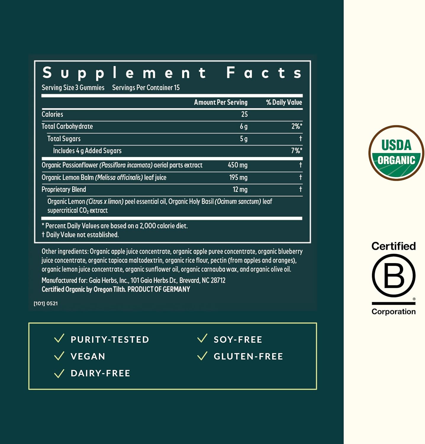 Gaia Herbs Organic Relax Gummies contain a blend of certified organic herbal ingredients. These gummies are formulated to support relaxation and contribute to healthy sleep patterns. They are made without synthetic ingredients and are suitable for adults seeking a plant-based supplement option.