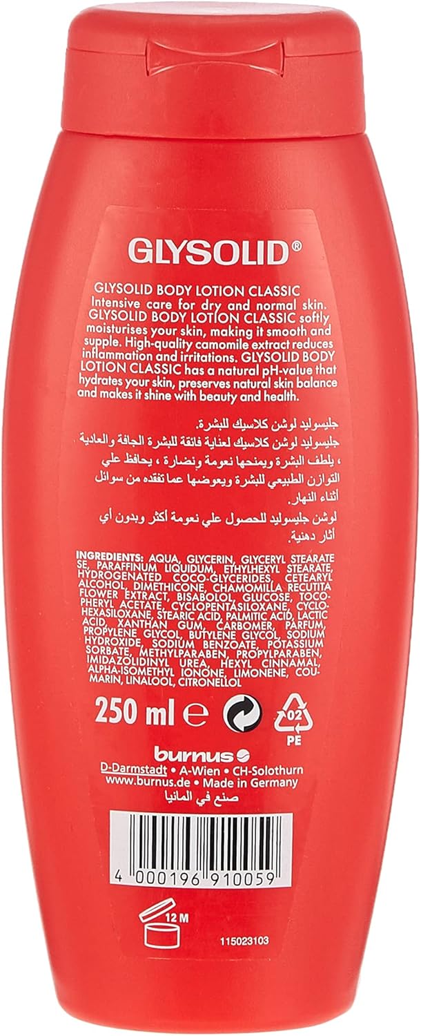Experience the legendary hydrating power of Glysolid Classic Body Lotion. This iconic formula is designed to deeply moisturize and protect severely dry, rough, and chapped skin. Enriched with glycerin and allantoin, it works to restore the skin's natural moisture balance, leaving it feeling soft, smooth, and supple without a greasy residue. Ideal for daily use, Glysolid creates a protective barrier that locks in moisture, offering long-lasting relief and improving skin elasticity.