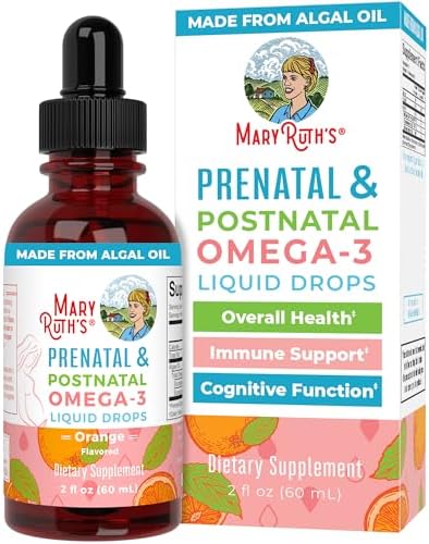 Support optimal health for both mother and baby with MaryRuth Organics Prenatal & Postnatal Omega-3 Liquid Drops. This premium, vegan-friendly supplement delivers essential Omega-3 fatty acids, including DHA and EPA, which are crucial for healthy fetal brain and eye development during pregnancy. It continues to provide vital cognitive support for infants through breastfeeding, while also aiding in maternal well-being and recovery before, during, and after childbirth, making it an indispensable part of your daily routine.