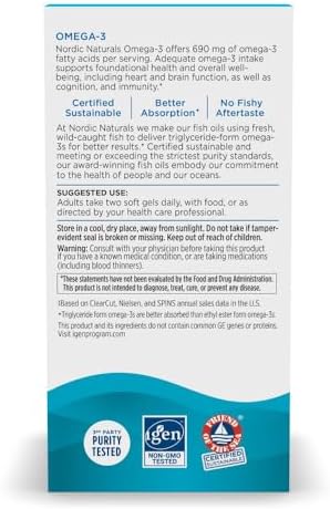 Elevate your daily wellness routine with Nordic Naturals Omega-3 Lemon soft gels. Crafted for superior Omega-3 support, this premium supplement delivers essential fatty acids vital for optimal health. Each serving provides 690mg of pure, potent Omega-3s, derived from high-quality fish oil, and enhanced with a refreshing lemon flavor to ensure a pleasant, fish-free experience. Support your cardiovascular, cognitive, and overall cellular health with this trusted formulation.