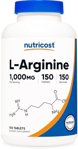 Boost your daily wellness routine with Nutricost L-Arginine 1000mg Tablets. L-Arginine is a vital amino acid that plays a crucial role in the production of nitric oxide, a compound essential for healthy blood flow and cardiovascular function. This high-potency supplement is designed to support various bodily functions, including promoting heart health, enhancing athletic performance, and maintaining general circulatory well-being. Each tablet delivers a robust 1000mg of L-Arginine, providing an efficient way to integrate this beneficial amino acid into your diet.