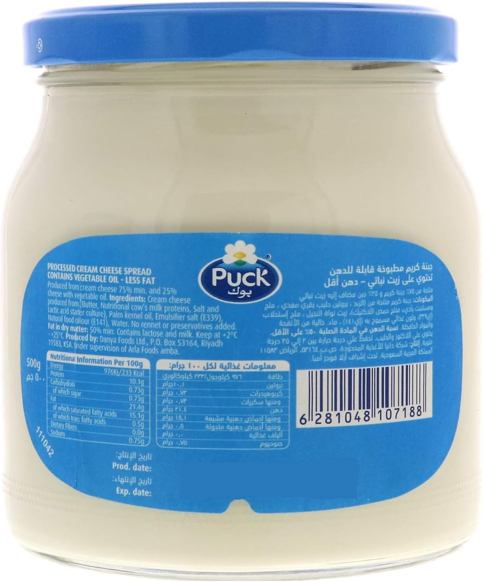 Enjoy the smooth, creamy taste of Puck Less Fat Cream Spread Cheese. This 240g jar offers a delicious and healthier alternative to traditional cream cheese, perfect for those mindful of their fat intake.
