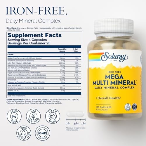 Support your overall health and well-being with Solaray Mega Multi Mineral (Iron-Free), a comprehensive blend of essential minerals designed to complement your daily nutritional intake. This advanced formula provides a wide spectrum of minerals crucial for various bodily functions, from bone health and nerve function to energy metabolism and immune support. Specifically formulated to be iron-free, it's an ideal choice for individuals who may not require additional iron supplementation or have specific dietary needs.