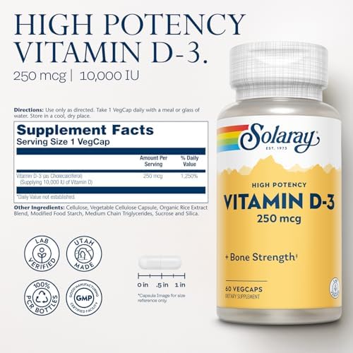 Boost your daily wellness with Solaray Vitamin D3 10,000 IU, designed to support crucial bodily functions. Often called the 'sunshine vitamin,' Vitamin D3 is essential for strong bones, a robust immune system, and maintaining a healthy mood. This high-potency formula ensures you get an optimal daily dose, especially beneficial for those with limited sun exposure or specific dietary needs. Solaray, a trusted name in supplements, delivers this vital nutrient in convenient, vegetarian VCapsules for easy absorption and purity you can rely on.