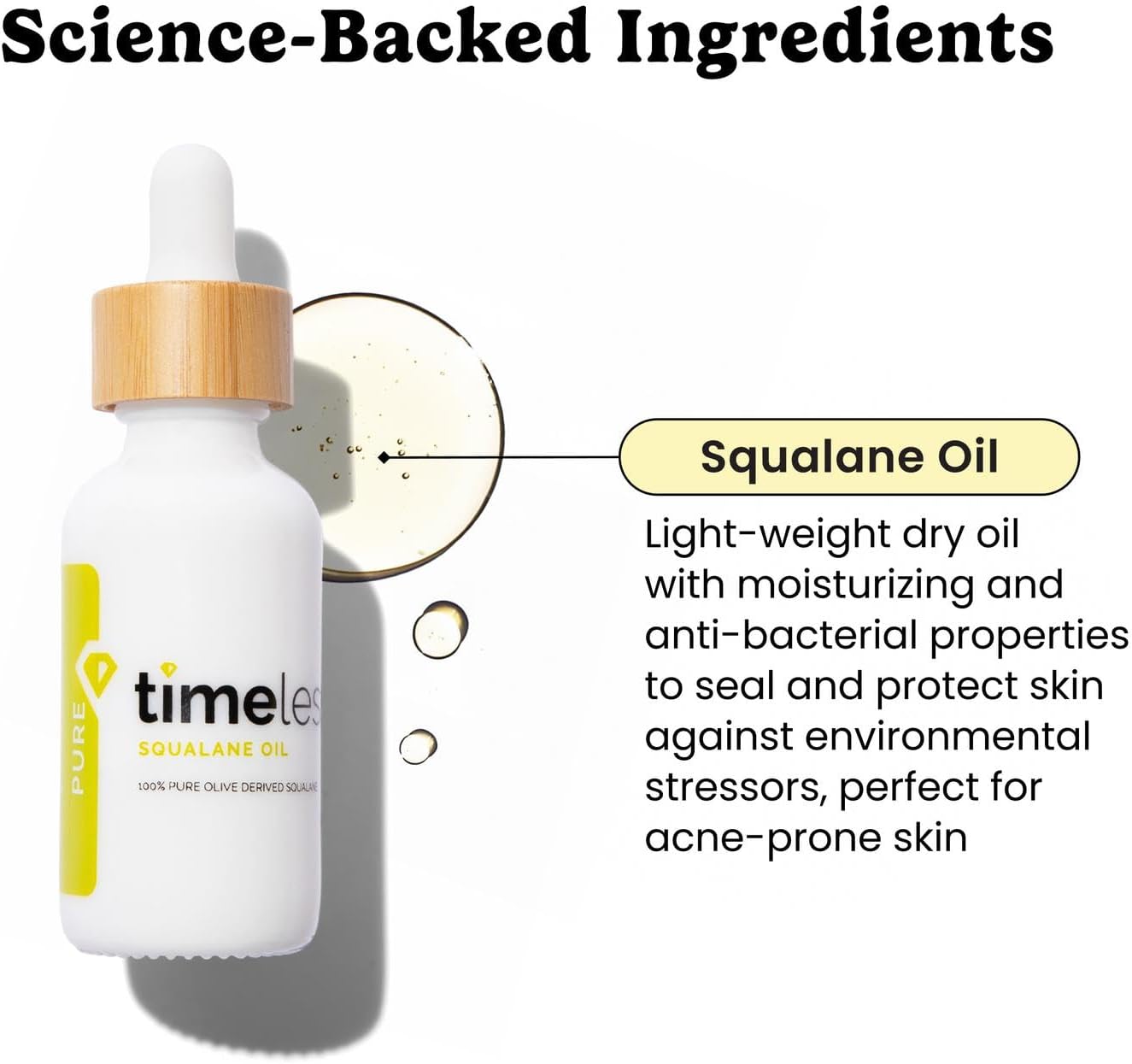 Discover the power of deep hydration with Timeless 100% Pure Squalane Oil. This premium, lightweight, and non-comedogenic oil is derived from olives, providing a natural emollient that deeply moisturizes your skin without clogging pores or leaving a greasy residue. Mimicking your skin's natural sebum, it works to restore and protect the skin's barrier, promoting a softer, smoother, and more radiant complexion. Perfect for all skin types, including sensitive and acne-prone skin, this pure Squalane Oil helps to diminish the appearance of fine lines and wrinkles, improve elasticity, and soothe irritation, making it an essential addition to your daily skincare routine.