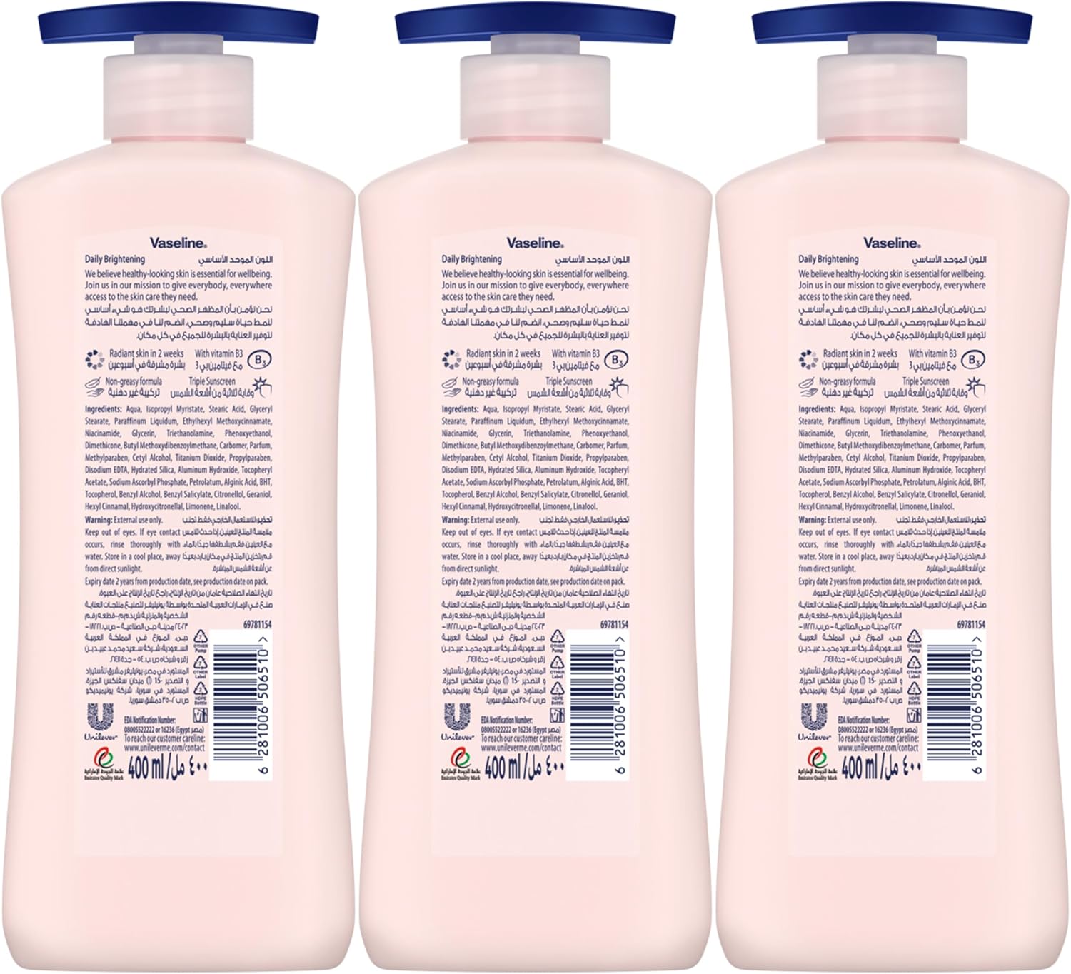 Achieve beautifully balanced and radiant skin with the Vaseline Even Tone Body Lotion. This specially formulated lotion is designed to help reduce the appearance of dark spots and uneven skin tone, leaving your skin visibly smoother and more luminous. Infused with micro-droplets of Vaseline Jelly, it deeply moisturizes to heal dry skin, while its active ingredients work to enhance your natural complexion. This convenient pack of three 400ml bottles ensures you have a consistent supply for daily use, promoting long-lasting hydration and an even, healthy glow.
