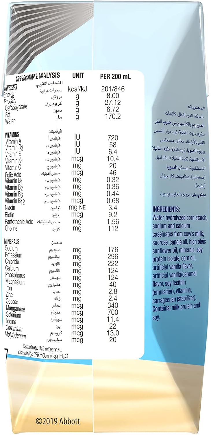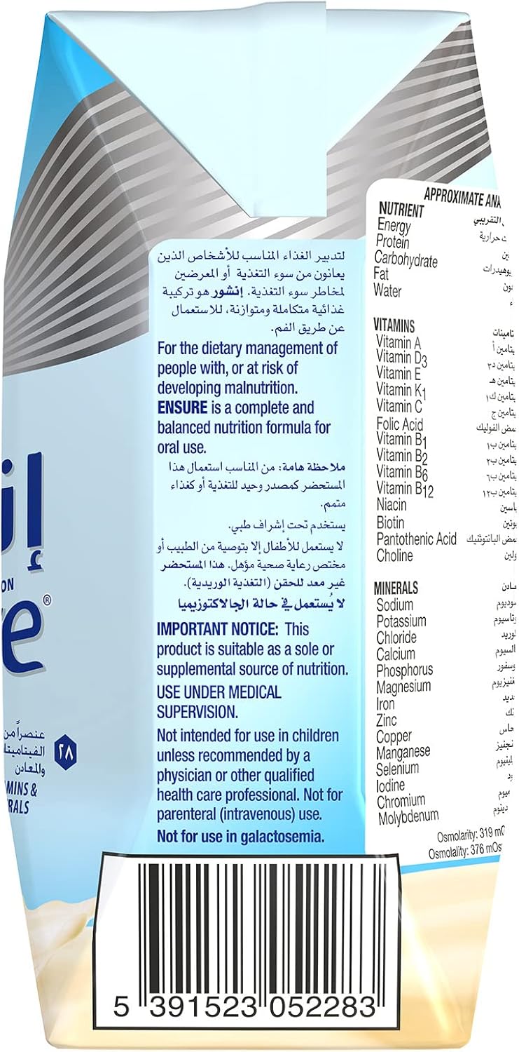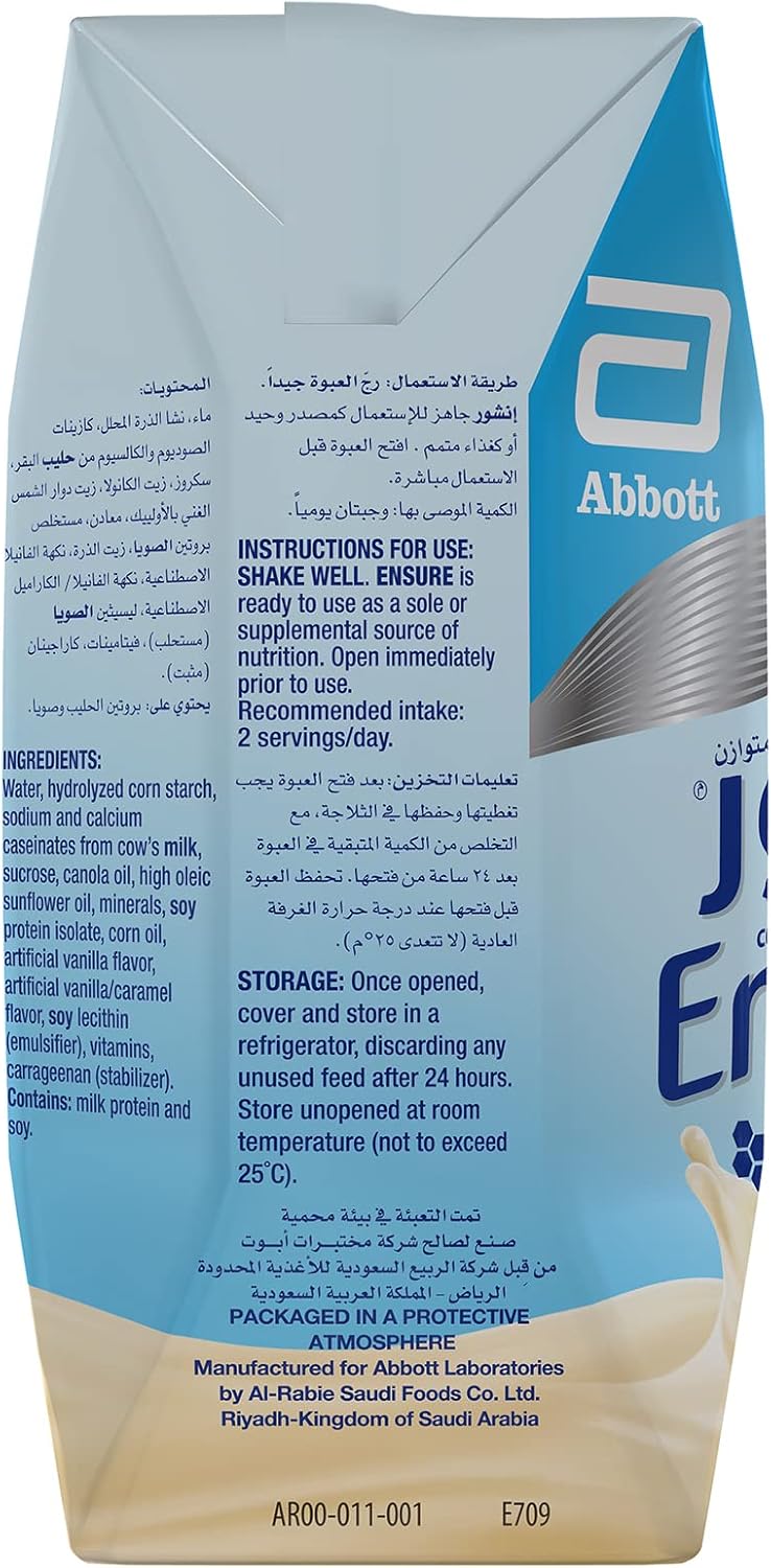Ensure Liquid Vanilla Formula Milk offers complete and balanced nutrition in a convenient 200ml ready-to-drink format. Specially formulated for adults, this delicious vanilla-flavored supplement provides essential vitamins, minerals, and protein to support energy levels, muscle health, and overall well-being. Ideal for individuals looking to supplement their diet, those recovering from illness, or simply seeking a nutritious boost, Ensure helps fill nutritional gaps and promotes vitality, making it a perfect choice for daily nutritional support.