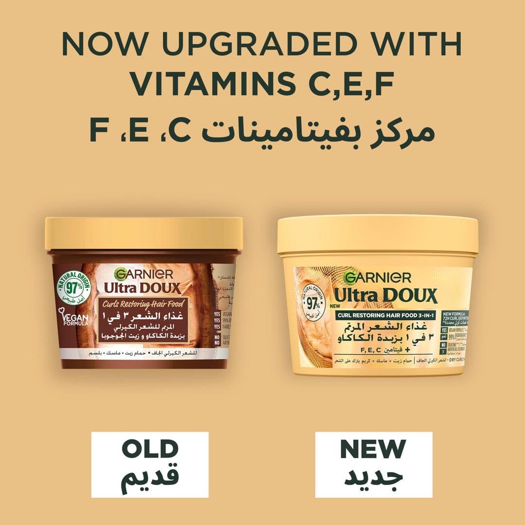 Transform and revitalize your curly hair with the Garnier Ultra Doux Hair Food Curls Restoring Cocoa Butter Mask. This luxurious 390ml mask is specifically formulated to nourish, restore, and define your curls. Infused with natural Cocoa Butter, it's designed to deeply condition and bring life back to dull, unruly hair, leaving your curls soft, bouncy, and beautifully enhanced.