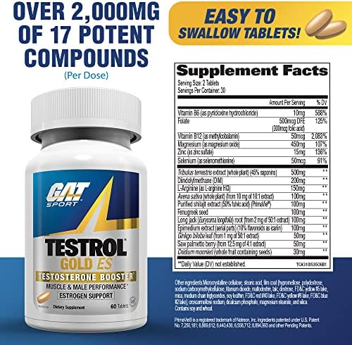 Unlock your peak potential with GAT SPORT Testrol Gold ES, a powerful and comprehensive male performance enhancer. Formulated with a synergistic blend of key ingredients like Tribulus, DIM, Zinc, Longjack, Fenugreek, and Saw Palmetto, this advanced supplement is designed to support natural testosterone levels, promote healthy estrogen balance, and enhance overall male vitality. Experience improved strength, stamina, and a renewed sense of well-being for optimal performance in and out of the gym.
