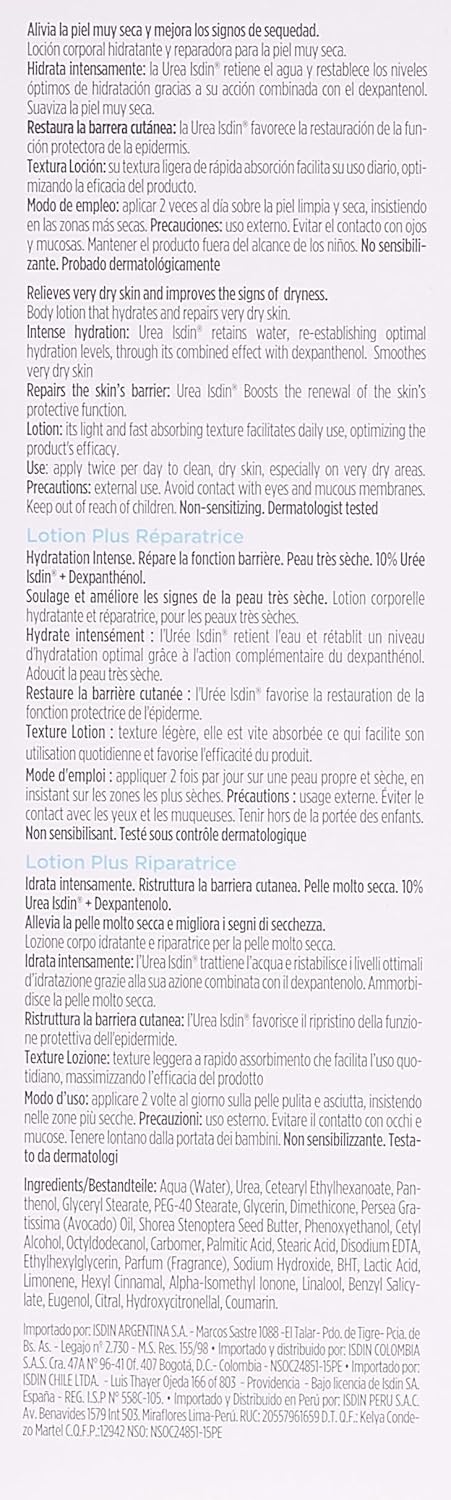 Discover intensive hydration and skin repair with ISDIN Ureadin Ultra 10 Repairing Lotion Plus. Formulated with 10% Urea, this advanced lotion provides deep moisture and restores the skin's natural barrier, making it ideal for very dry, rough, and flaky skin. Experience immediate comfort and long-lasting softness as it reduces feelings of tightness and irritation, promoting a healthier, smoother complexion.