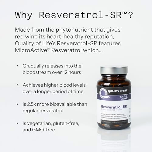 Unlock the secret to vibrant longevity with Quality of Life's Powerful Anti-Aging Resveratrol SR. This premium, all-natural formula is expertly designed to support your body's natural anti-aging processes, promoting cellular health and overall vitality. Resveratrol, a powerful antioxidant derived from natural sources, works to combat oxidative stress, support cardiovascular health, and maintain youthful energy, helping you feel your best at any age.