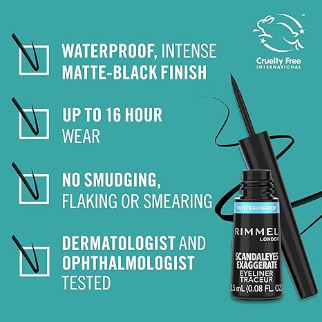 Achieve a bold, dramatic eye look that lasts all day with the Rimmel London Exaggerate Waterproof Liquid Eyeliner. Designed for precision and intensity, this eyeliner delivers a rich, true black pigment that defines your eyes with a stunning, long-lasting finish. Its waterproof formula ensures your look stays flawless through humidity, tears, and busy days, without smudging or fading. The easy-to-use felt tip glides smoothly, allowing for effortless application from fine lines to thick, exaggerated wings, making it a must-have for both everyday wear and special occasions.