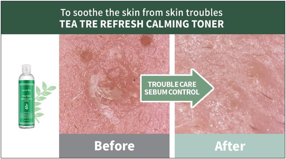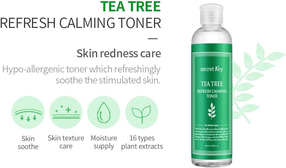 Discover the soothing power of Secret Key Tea Tree Calming Toner, specifically formulated to bring balance and comfort to sensitive and blemish-prone skin. Infused with a high concentration of natural tea tree extract, this refreshing toner works diligently to calm irritation, reduce redness, and control excess oil without stripping the skin's natural moisture barrier. Its gentle, purifying properties help to minimize the appearance of pores and prevent future breakouts, leaving your complexion feeling clean, refreshed, and visibly clearer. Ideal for daily use, this toner prepares your skin perfectly for subsequent skincare steps, enhancing their absorption and effectiveness.