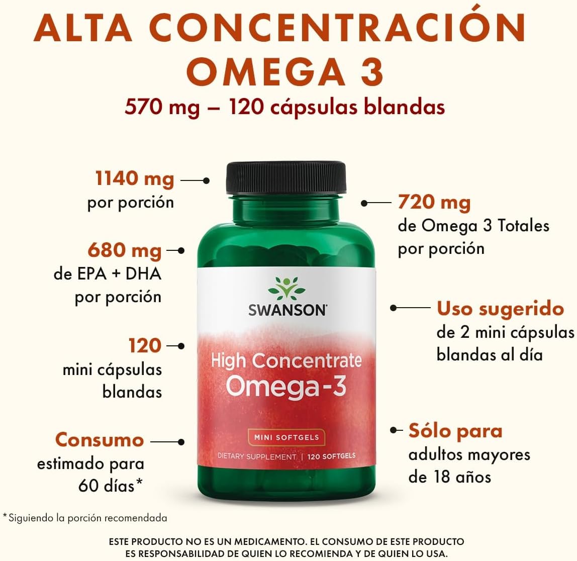 Swanson High Concentrate Omega-3 Fish Oil is a dietary supplement containing omega-3 fatty acids, including EPA and DHA, which are essential nutrients not synthesized by the human body. Each softgel provides concentrated fish oil derived from marine sources.