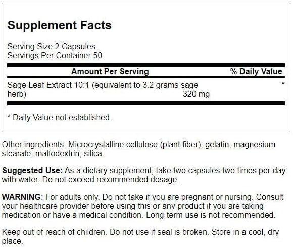 Swanson Sage 10:1 Extract is a concentrated herbal supplement derived from sage leaf. Each capsule contains a 10:1 extract, meaning it is formulated to deliver ten times the amount of sage material compared to standard sage leaf powder. This product is intended for use as a dietary supplement.