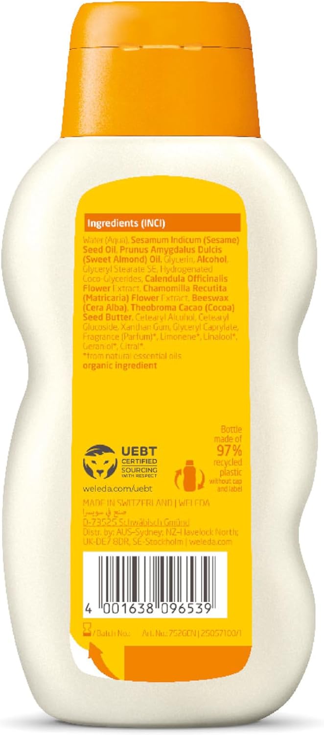 Indulge your skin with the gentle care of Weleda Calendula Body Lotion. Specifically formulated for sensitive skin, this nourishing lotion provides long-lasting hydration while soothing dry or irritated areas. Infused with organic calendula extract, known for its calming and restorative properties, it helps to maintain the skin's natural moisture balance and leaves it feeling soft, smooth, and comfortable. Its light, non-greasy formula absorbs quickly, making it ideal for daily use after showering or bathing.