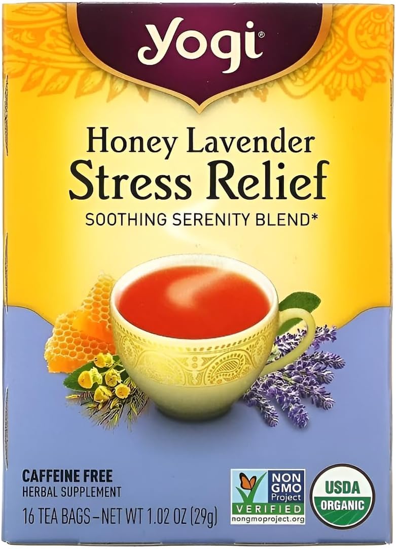 Yogi Tea's Honey Lavender Stress Relief blend combines organic lavender flower and honey flavor to help calm the mind and body. This herbal tea is carefully crafted to promote relaxation and support healthy stress management. Each pack contains 16 individually packaged tea bags, offering a convenient and delicious way to unwind any time of day.