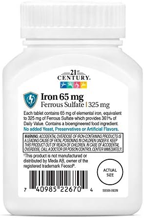 Boost your vitality and support crucial bodily functions with 21st Century Iron 65mg. This essential mineral is vital for the formation of healthy red blood cells, which are responsible for transporting oxygen throughout your body. Adequate iron intake helps combat fatigue, supports energy production, and is fundamental for overall health and well-being. Specially formulated by 21st Century, a brand committed to quality and health, each tablet provides a potent dose of iron to help you maintain optimal energy levels and support your circulatory system.