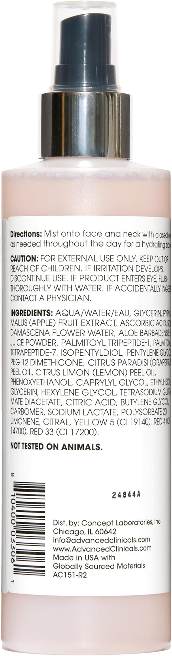Illuminate your complexion with the Advanced Clinicals Vitamin C Glow Facial Toner Mist. This refreshing facial mist is expertly formulated with potent Vitamin C to help brighten and even out skin tone, leaving your skin with a radiant, healthy-looking glow. Designed to tone, hydrate, and prep your skin, it's the perfect step to follow cleansing or to refresh your skin throughout the day. Experience a burst of citrusy goodness as this mist revitalizes dull skin, promoting a more vibrant and youthful appearance.