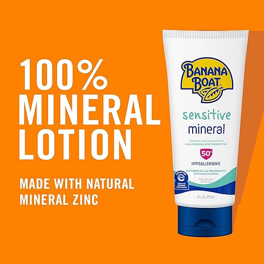 Safeguard your skin with the gentle yet powerful Banana Boat Sensitive Mineral Sunscreen Lotion SPF 50. Specially formulated for sensitive skin, this lotion provides robust broad-spectrum protection against the sun's harsh UVA and UVB rays using 100% naturally sourced zinc oxide. Its lightweight, non-greasy formula is designed to glide on smoothly without irritating delicate skin, ensuring you stay protected during all your outdoor adventures.