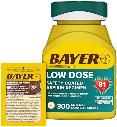 Discover comprehensive relief and cardiovascular support with Bayer Aspirin. This essential pack combines 300 tablets of 81mg low-dose aspirin, widely recommended by doctors for daily use to help prevent recurrent heart attacks and ischemic strokes, alongside powerful pain and fever relief. It’s also effective for temporary relief of headaches, muscle pain, toothache, minor arthritis pain, and the pain and fever of colds.