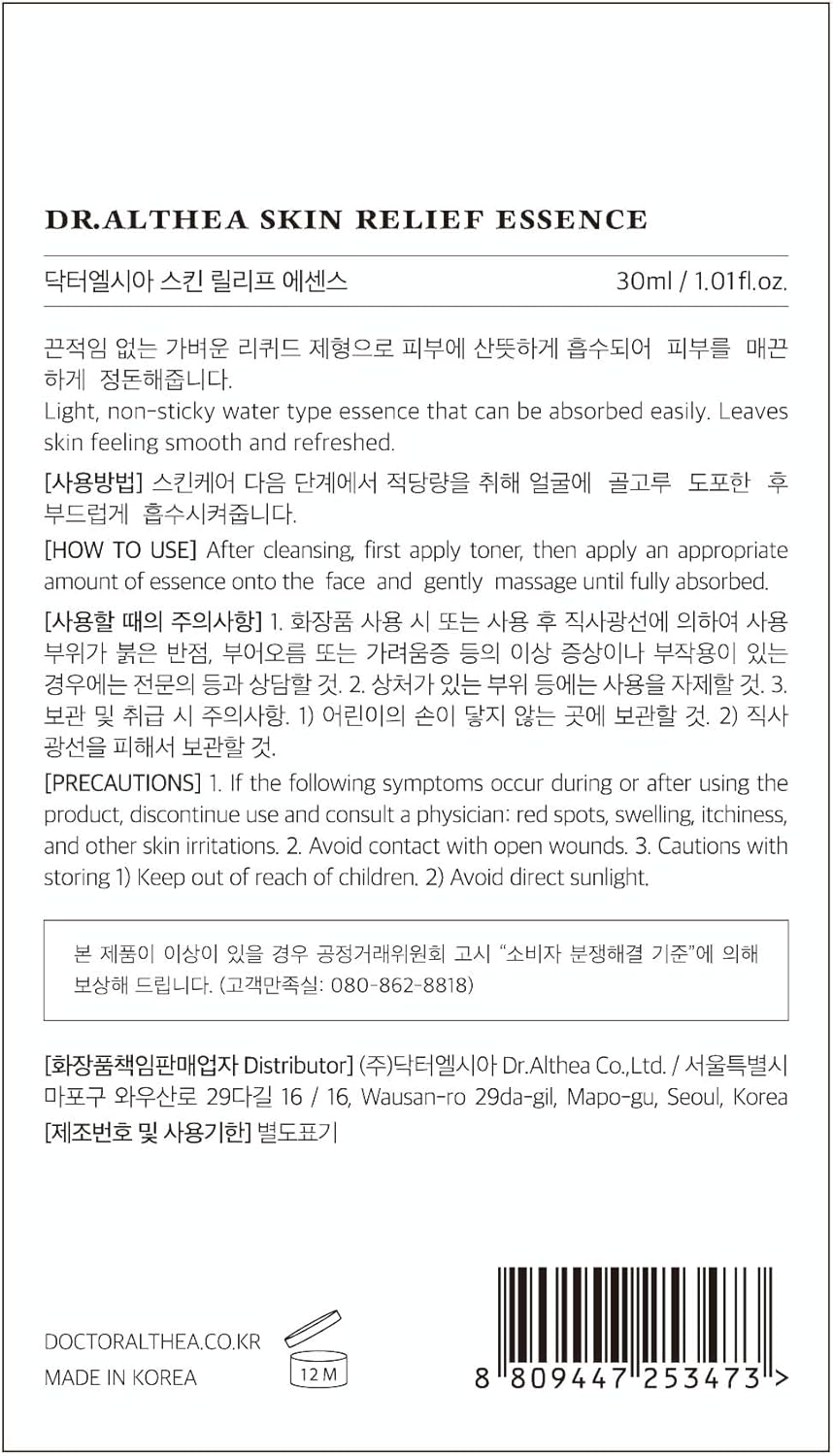 Discover the secret to deeply hydrated and revitalized skin with Dr. Althea Relief Essence. This luxurious Korean cosmetic serum is formulated with an impressive 85% deer placenta extract, known for its powerful rejuvenating and skin-repairing properties. Infused with refreshing peppermint, it delivers a soothing sensation while intensely moisturizing and improving skin elasticity. Perfect for those seeking a radiant, supple, and healthier-looking complexion, this essence is a must-have in your daily skincare ritual to combat dryness and promote a youthful glow.