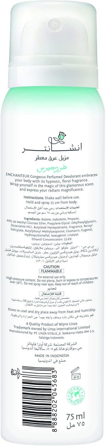 Experience all-day confidence and an irresistible aroma with the Enchanteur Gorgeous Perfumed Deodorant Spray. Infused with a captivating fragrance, this deodorant spray keeps you feeling fresh and elegant from morning to night. Its advanced formula provides reliable protection against body odor while enveloping your senses in a beautiful, long-lasting scent that complements your charm.