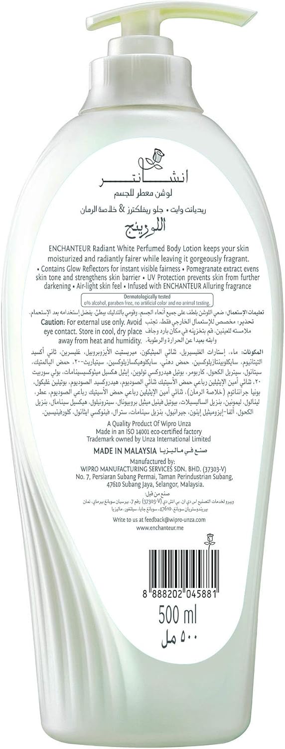 Unveil a new level of luminosity with Enchanteur Radiant White Lotion, expertly formulated to give you visibly glowing and fairer-looking skin. This luxurious body lotion deeply nourishes while working to enhance your skin's natural radiance, leaving it beautifully soft, smooth, and delicately fragrant. Embrace the enchanting journey to a more vibrant and even-toned complexion with every application.