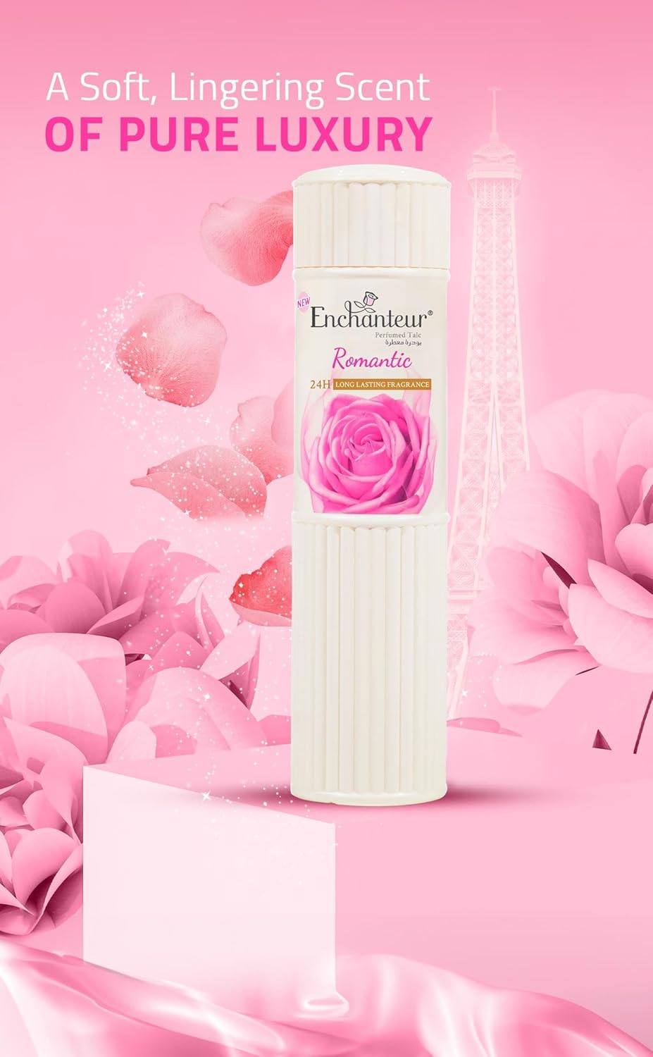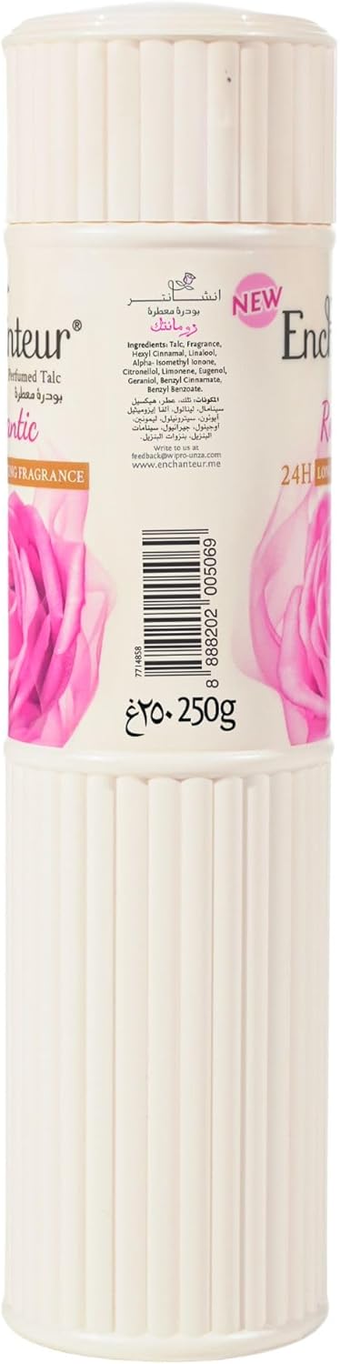 Indulge your senses with the exquisite Enchanteur Romantic Perfumed Talc, a luxurious body powder designed to envelop you in a captivating and long-lasting fragrance. This finely milled talc is infused with the enchanting essence of romantic Rose and exotic Jasmine, creating a sophisticated aroma that uplifts your mood and leaves a delicate trail wherever you go. Perfect for everyday elegance, it ensures your skin feels silky smooth, fresh, and beautifully scented throughout the day.