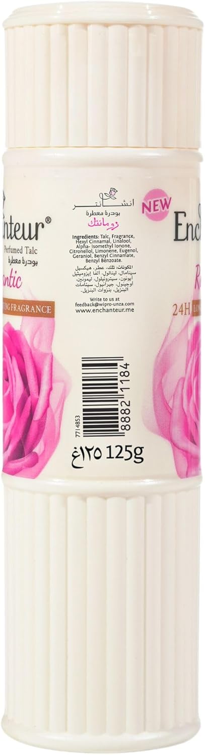 Indulge your senses with the luxurious Enchanteur Romantic Perfumed Talc, a delicate body powder infused with the enchanting blend of blooming roses and sweet jasmine. This finely milled talc leaves your skin feeling silky smooth, refreshed, and subtly fragrant throughout the day, enveloping you in a captivating and romantic aura. Perfect for after a bath or shower, it helps absorb excess moisture, keeping you comfortable and confident with a long-lasting, beautiful scent.
