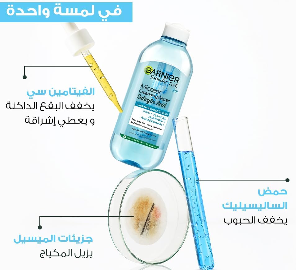 Discover the power of Garnier SkinActive Micellar Cleansing Water infused with Salicylic Acid, specifically formulated for acne-prone skin. This all-in-one solution effectively removes makeup, cleanses, and purifies your skin without harsh rubbing or rinsing. The addition of Salicylic Acid targets blemishes, helps reduce excess oil, and prevents new breakouts, leaving your skin feeling clean, fresh, and clearer. It's gentle enough for daily use and suitable for sensitive skin.