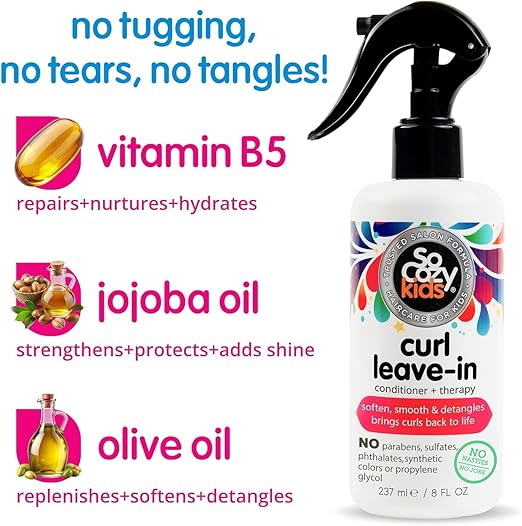 Give your child's hair the gentle care it deserves with SoCozy Curl Spray Leave-In Conditioner. Expertly formulated to detangle knots and restore natural curl patterns, this leave-in conditioner makes hair management a breeze for parents and a joy for kids. Infused with nourishing ingredients like Jojoba Oil, Olive Oil, and Vitamin B5, it helps to hydrate and strengthen delicate strands without weighing them down. The delightful Sweet-Pea scent adds a touch of freshness, leaving hair soft, manageable, and wonderfully fragranced. Designed with your child's well-being in mind, our formula is free from harsh parabens, sulfates, synthetic colors, or dyes, ensuring a clean and safe conditioning experience.